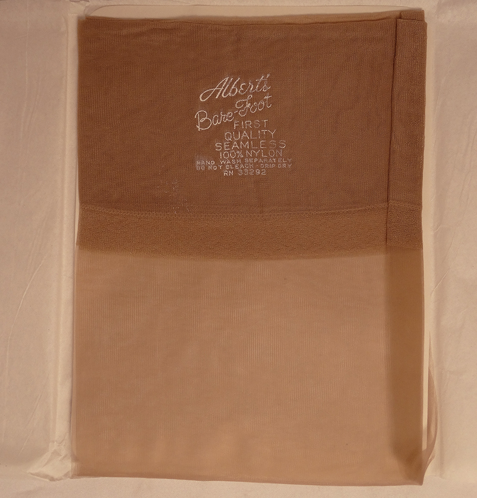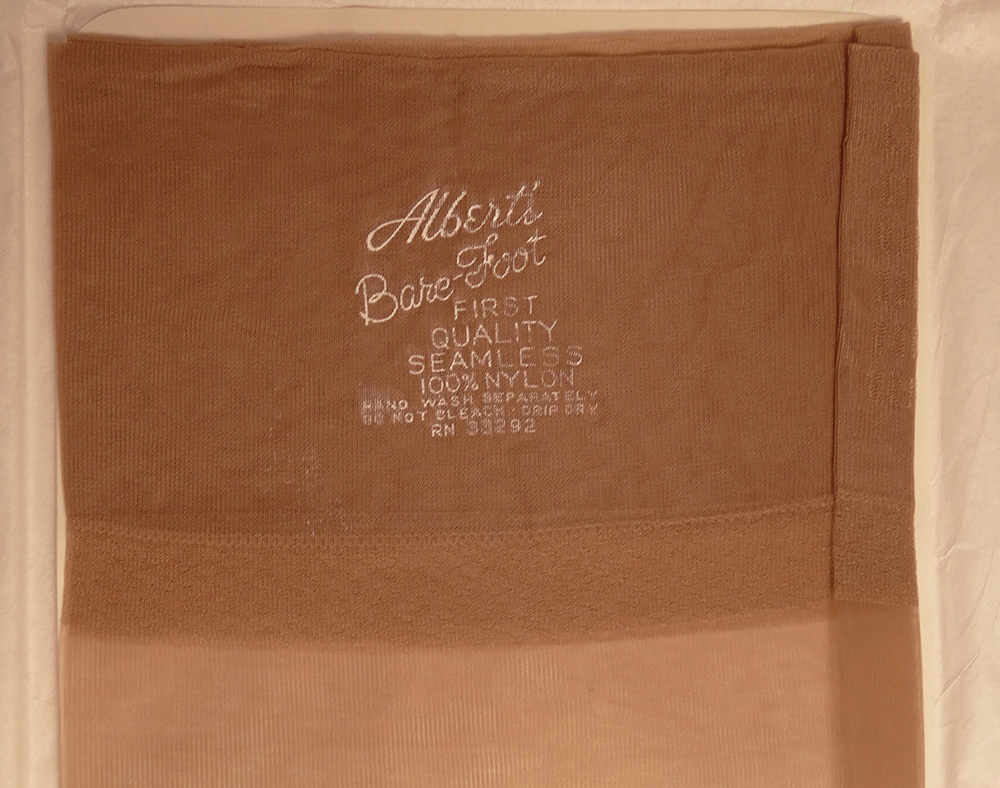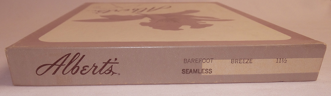 Albert's famous 'Barefoot' line! This style is 'sandalfoot', the heel and toe are 'nude' (not reinforced). These are by far a fine example of a high quality delicate stocking that Alberts was famous for. Almost impossible to find in larger sizes and in pristine condition, we have a selection of colors in size 11 1/2 medium. The flat knit, soft as silk nylon is very sheer right down to the nude heel and toe. Full Albert's imprint, 100% nylon, first quality. Almost all the Alberts stocking we have measured are quite generous in length; size 11 1/2 M runs about 38 inches in length. The stocking in the photos is the color 'breeze', close to a bronze to light tan shade. To keep these from being damaged, follow all guidelines (use hand lotion of hosiery gloves) when handling them. Price will vary with color.